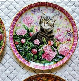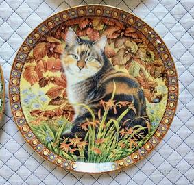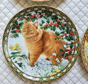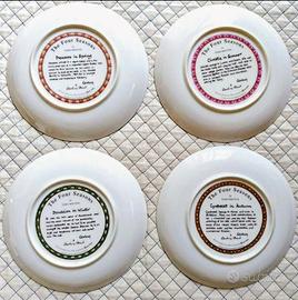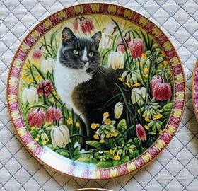 ogni piatto rappresenta un gatto e una stagione dietro ogni piatto c'è la descrizione in inglese e il nome del gatto