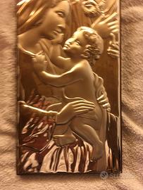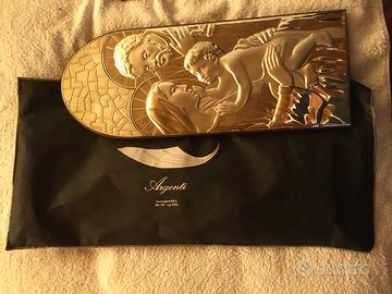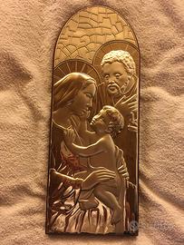 Icona in foglio di argento su fondo in legno di mogano rappresentante giuseppe. Maria e bambino gesu alta 50 cm larga 20 cm originale Argenti Valenti 18 gr