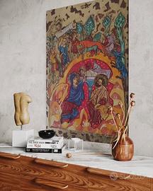 La Natività di Mimmo Camassa è una visione luminosa e profondamente spirituale della nascita di Cristo, interpretata attraverso il linguaggio dell’iconografia medievale riletto in chiave contemporanea. L’artista combina fedeltà simbolica e intensa vitalità cromatica, trasformando la scena sacra in un racconto che vibra di fede, stupore e mistero.
