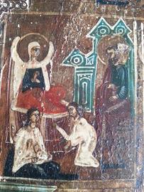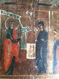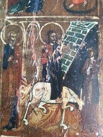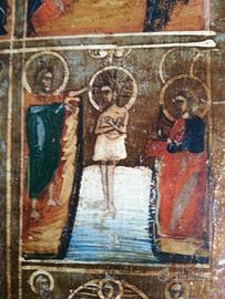 autentica icona di fine ottocento comperata da un antiquario di Tallin (Estonia) una decina di anni fa video su you tube n° 20151204 095923 Misura cm 30 x 35 x 2 Le chiese di tradizione bizantina raggruppano sotto l'espressione "dodici grandi feste" le principali solennità liturgiche dell'anno, in cui si commemorano gli eventi che costituiscono l'annuncio della fede della Chiesa. Alcune di queste feste sono celebrate : Natività di Maria (8 settembre), Esaltazione della Croce (14 settembre), Presentazione di Maria al tempio (21 novembre), Natale (25 dicembre), Battesimo/Epifania (6 gennaio), Presentazione di Gesù al tempio (2 febbraio), Annunciazione (25 marzo), Trasfigurazione (6 agosto), Dormizione (15 agosto). Approfittatene! Non ce n'è un altra e potrebbe sfuggirvi! Video you tube, cercate: "icona russa Estone"
