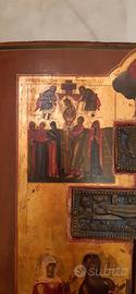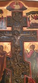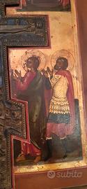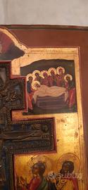 Icona russa a stauroteca dimensioni 44.5 per 36.5, croce centrale con smalti, metà 1800 in buone condizioni . Visione e ritiro in Milano città. Non spedisco