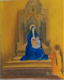 In Dipinto religioso realizzato con tecnica ad olio su Tela che cattura l'essenza dell'arte medievale con archi gotici e sfondo dorato Opera raffigurante una scena sacra con Madonna e Bambino, ambientata in un'architettura gotica Realizzato con colori vivaci e luminosi, con particolare attenzione ai drappeggi e alle proporzioni architettoniche L'opera trasmette un'atmosfera di profonda spiritualità, enfatizzata dall'uso della luce dorata dello sfondo Fornito di Certificato di Autenticità e Gancio per Appendere Misura 23x30cm