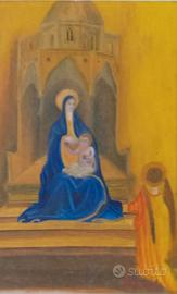 In Dipinto religioso realizzato con tecnica ad olio su Tela che cattura l'essenza dell'arte medievale con archi gotici e sfondo dorato