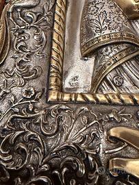 L'icona presenta una lavorazione in pregiato argento 950 sbalzato, applicata sopra la figura sacra, con dettagli dorati per i volti e le vesti. Realizzata in Grecia. Presente punzonatura 950.