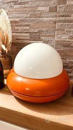 La lampada presenta una base circolare in metallo laccato in un vibrante arancione d'epoca, sormontata da un grande diffusore semisferico in vetro opalino bianco che garantisce una diffusione della luce calda e uniforme. Piccoli segni di usura sul cavo di accensione.