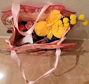 VENDO REGALO PER FESTA DELLA DONNA COMPOSTO BIGLIETTO D’AUGURI 3D A FORMA DI CESTINO DI FIORI CON CIOCCOLATINI E TORRONCINI. RIMANE IN PIEDI CREANDO UN EFFETTO SCENOGRAFICO. INCLUDE MANICI IN NASTRO ROSA E MIMOSA. NUOVO