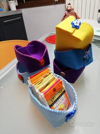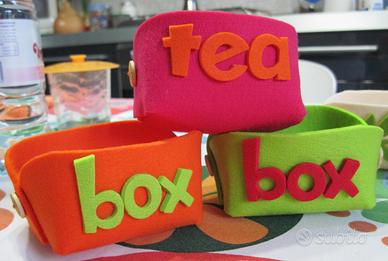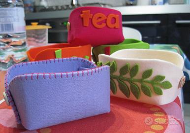 Tea box in pannolenci da 3,5 mm di spessore, in diverse colorazioni e aspetto (semplice con punto festone ricamato a mano o con la scritta "tea box" sui due lati) misura circa quanto metà scatola da te, cm 8x6,5 x5h