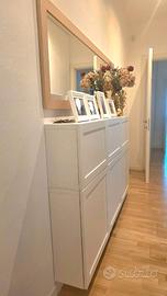 Composizione BESTÅ bianca completa di ante bianche HANVIKEN in due formati. Porta bicchieri, portaoggetti, svuota tasce per l'ingresso, madia.