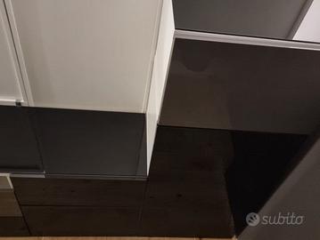 Vendo mobili IKEA con contenitori e cassetti IKEA in legno bianco, finitura anteriore laccato lucido, colori nero e grigio. Top in vetro fumè.