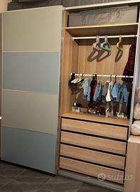 Armadio Pax con ante scorrevoli costituito da 2 moduli da 100cm e ante scorrevoli bi-color (volendo con poco si possono rinnovare o mettere specchi), 8 cassetti e accessori come in foto. Acquistato 8 mesi fa, praticamente nuovo. La famiglia si è allargata e mi serve spazio...!!!