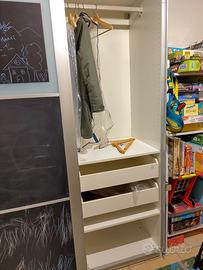 Vendo Ikea Pax con ante scorrevoli. Dimensioni: 236x150x43 Interni come da foto: appendiabiti in entrambi le parti. 4 ripiani. 2 cassetti Le ante sono state in parte ridipinte con la pittura a lavagna. Le scritte/disegni attuali sono facilmente cancellabili.