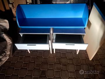 PREZZO=200 EURO) (NON SPEDISCO - SI VENDE TUTTO IL LOTTO INSIEME- SE VOLETE LA SPEDIZIONE INVIATE VOI IL CORRIERE CON PAGAMENTO AL RITIRO E VI ACCOLLATE VOI LA RESPONSABILITA' SE LA MERCE PRENDE COLPI E ARRIVA AMMACCATA O NON FUNZIONANTE) - IKEA SCRIVANIA BLU - COMODINI BIANCHI TOP VIOLA - LETTO 1/2 PIAZZA + MATERASSO (EMINFLEX) - PORTA COMPUTER NERO CON ROTELLE CHE SI INFILA SOTTO LA SCRIVANIA - SGABELLO CON ROTELLE BLU IN TINTA CON LA SCRIVANIA