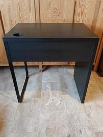 scrivania Ikea micke nera in legno e metallo. facile da spostare. comoda per lavorare con pc. È facile tenere cavi e multiprese a portata di mano ma non in vista grazie all'apertura sul pannello di fondo. Puoi montare le gambe a destra o a sinistra, in base al tuo spazio e alle tue preferenze. presenta piccole imperfezioni già in acquisto:3 piccole bolle come da foto peso massimo 50kg. peso massimo cassetto 3kg