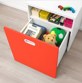 Contenitore giocattoli con rotelle, bianco/rosso, 60x50x64. Utilizzabile anche come piccola scrivania x bambini.
