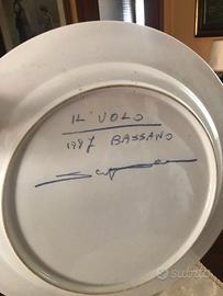 Il piatto decorativo raffigura un mazzo di fiori e due farfalle in uno stile acquerello e a schizzo, dipinto a mano con uno stile astratto e abbozzato, che ne suggerisce la natura artigianale o artistica. Ha un diametro di circa 60 cm e non presenta crepe, inoltre è presente sia nella parte frontale che retrostante la firma dell'Autore e la data di termine.