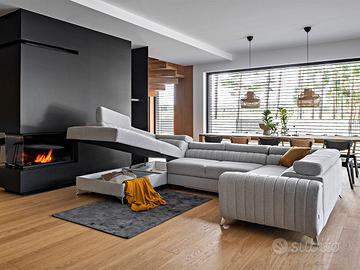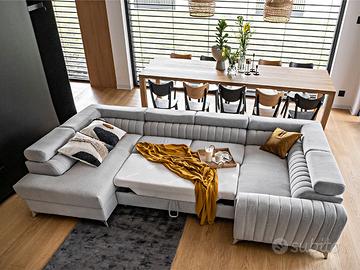 Divano letto con angolo ad U dotato di box contenitore, lavorazione trapuntata, in 13 affascinanti colori! Un divano angolare matrimoniale ad U funzione letto e box contenitore molto raffinato e dal design ricercato è il modello Colonia. Questo divano infatti, oltre ad avere la struttura e la funzionalità tipiche dei nostri divani angolari ad U, presenta una serie di particolari elementi che lo distinguono e lo caratterizzano. Ha in dotazione un ampio box contenitore sotto la parte ad angolo, molto ampio e pratico; è inoltre dotato di funzione letto, che si ottiene alzando il meccanismo centrale posto sotto la seduta, ed infine è dotato di 4 poggiatesta reclinabili con movimento fine-corsa. Questo modello ad U ha le parti angolari che si differenziano poiché una è una penisola e l’altra è una seduta a due posti provvista di elegante bracciolo trapuntato. Sottolineiamo quindi che oltre le tipiche caratteristiche delle nostre proposte di divani angolari ad U, Colonia presenta per tutto il suo perimetro una originale lavorazione trapuntata molto elegante e di grande carattere; i suoi piedini inoltre sono alti, minimali e moderni. Con tutte le sue caratteristiche positive ed i suoi plus, il divano Colonia ha un rapporto qualità/prezzo davvero elevato e difficile da trovare sul mercato dell’arredamento. Colonia è un divano angolare robustissimo e di ottima qualità, dal peso di ben 230 Kg! Sottolineiamo che il rivestimento della funzione letto che fuoriesce può essere di colore diverso da quello evidenziato in foto e comunque non è in tinta ed è differente dalla combinazione di colore del divano che si sceglie. Misure: lunghezza 340 cm – altezza 96 cm – profondità 202/202 cm – dimensione letto 210×125 cm EXCELLENT LINE – GARANZIA DI 2 ANNI COME DA NORMATIVA EUROPEA STRUTTURE INTERNE E RIVESTIMENTI MOLTO RESISTENTI PRODOTTO ROBUSTISSIMO E DI ALTA QUALITA’!