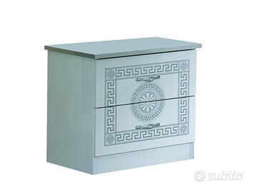 Il modello Damasco è pensato per coloro che apprezzano la bellezza dei mobili che raccontano una storia. Ogni elemento è curato nei dettagli, dalla specchiera con cornice sagomata che richiama la testiera, alla struttura robusta e duratura. È la scelta ideale per ambienti in stile classico, neoclassico o per chi desidera aggiungere un opulenza a un arredamento più contemporaneo. I materassi e le reti idonei per il letto 160×200 cm sono delle seguenti misure: 160 x 190/195/200 cm mentre per il letto 180×200 cm sono delle seguenti misure: 180 x 190/195/200 cm. La rete necessita di 4 piedi di sostegno. Il peso complessivo del gruppo letto Damasco è di 255 kg! Testiera e Pediera Imponenti: il letto matrimoniale è il protagonista assoluto, con una testiera elegantemente sagomata e impreziosita dalla splendida imbottitura capitonné in ecopelle bianca. Finiture di Prestigio: la combinazione di un luminoso color bianco con i dettagli argento applicati sui profili e sulle decorazioni frontali offre un contrasto caldo e lussuoso, tipico dell’arredamento di alta classe. Comodini e Cassettiera Coordinati: il set include due comodini e una capiente cassettiera con specchiera, tutti caratterizzati dagli stessi motivi decorativi a greca. Le maniglie argento completano il design, garantendo funzionalità e coerenza estetica. MISURE: Letto 160: larghezza 193 cm – altezza 119 cm – profondità 220 cm Letto 180: larghezza 213 cm – altezza 119 cm – profondità 220 cm Comodini: larghezza 50 cm – altezza 50 cm – profondità 43 cm Comò: larghezza 116 cm – altezza 76 cm – profondità 43 cm Specchio: larghezza 94 cm – altezza 110 cm – profondità 9 cm
