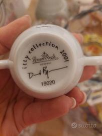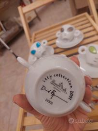 Illy Art Collection 2001 “Alien Cups” David Byrne – Set Raro – 4 tazzine + zuccheriera + 6 cucchiaini – Rosenthal Descrizione: Proposto in vendita un autentico set da collezione della Illy Art Collection 2001, disegnato da David Byrne, celebre per l’iconica serie “Alien Cups”, tra le più ricercate e riconoscibili a livello internazionale. Produzione Rosenthal Germany, sinonimo di eccellenza nella porcellana. Composizione del set: 4 tazzine da espresso con piattini originali (decorazioni con “occhi alieni” in vari colori) 1 zuccheriera coordinata originale 6 cucchiaini Illy originali Provenienza: Acquistate direttamente presso una caffetteria Illy ufficiale nei primi anni 2000, al momento della loro uscita sul mercato. Condizioni: Le tazzine non sono mai state utilizzate. Conservate ed esposte esclusivamente in vetrina per oltre 20 anni. Condizioni eccellenti, prive di scheggiature, crepe o difetti. (Scatola originale non disponibile) Un set ideale per collezionisti, appassionati di design contemporaneo e amanti della Illy Art Collection. Prezzo: €420 Disponibile a valutare offerte serie. Spedizione accurata o consegna a mano.