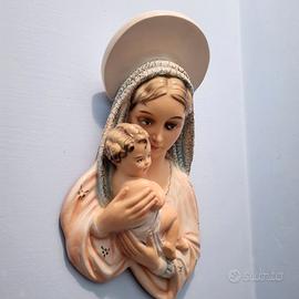 Immagine mostra un bassorilievo vintage della Madonna col Bambino, probabilmente in gesso o ceramica dipinta, tipico oggetto da collezione religiosa. La Vergine Maria che tiene in braccio Gesù Bambino.