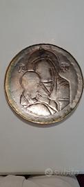 Immagine sacra da parete raffigurante la Madonna con Gesù bambino. Materiale metallo e diametro di 24 cm