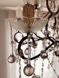 13 luci (12 a candela con piattino finemente cesellato e 1 centrale) in ferro battuto pieno color oro e cristallo. Gocce, catenelle, ampolline color grigio, ametista e bianco.