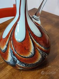 Il corpo slanciato in vetro soffiato presenta un dinamico motivo a fiamma che alterna un rosso rubino vibrante, bianco lattimo e finiture in nero profondo. Il manico in cristallo trasparente, applicato a caldo, segue la linea elegante del collo fino alla raffinata bocca a 'becco d'anatra'.