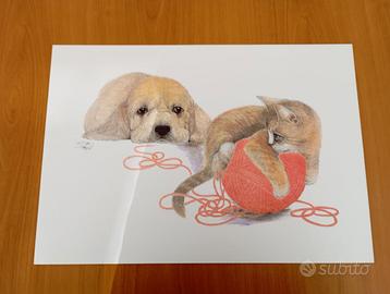 Bellissime stampe raffiguranti cani e gatti insieme. Misura: 35cm x 50cm. Prezzo: 7€ cadauna.