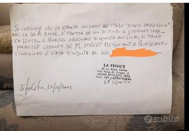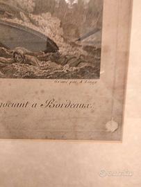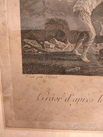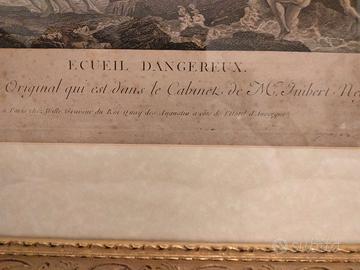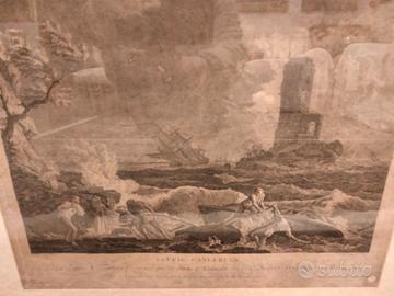 Pregiata incisione del XVIII secolo, incorniciata, titolo "Ecueil Dangereux", opera di Adrian Zingg. - Cornice dorata con decorazioni , non antica. - Incisione di alta qualità con scena marina e torre. - Firmata A. Zingg in basso. -Adrian Zingg fu un pittore/incisore svizzero ( 1734/1816). -L'incisione raffigura una scena di naufragio. -Perfette condizioni estetiche. Titolo: Ecueil dangereux ( trappola pericolosa). - L' incisione è relativamente grande, di qualità, certificata, molto più bella dal vivo (il vetro non permette di vedere bene la scena del naufragio), risale al 1700, nord Europa, ed è tratta da un quadro del pittore Claude Joseph Vernet ( allego foto quadro del Vernet da cui è tratta l'incisione) il quale era solito, negli innumerevoli ritratti di paesaggistica marina, rappresentare eventi naturali come naufragi, tempeste, bonacce. - La stampa/incisione è del 700 : carta del 700, incisore del 700, dipinto da cui è tratta è del 700. - Ingombro ovvero misure del quadro 57 cm X 60. - Incisione senza passpartou : 44 x 40 cm. Nessuna responsabilita' per danni da spedizione. Spese di spedizione 25 euro, a parte. Imballaggio accurato. Per ulteriori informazioni, prima e nn dopo la eventuale vendita.