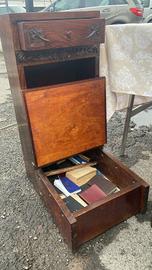 Inginocchiatoio da camera dell'800, in noce massello, intarsiato, con cassetto, mensole per libri e vano contenitore.