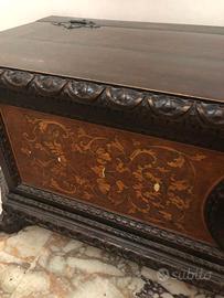Vendo in blocco arredamento d’epoca per ingresso, principalmente in stile "Neo Rinascimento" italiano e Luigi XV. I mobili in stile Neo Rinascimento, di fabbricazione di inizio Novecento, sono in legno massiccio ebanizzato nero, con le decorazioni scolpite a motivi floreali e geometrici, colonne tornite, cartigli, piedi a zampa di leone. Quelli in stile Luigi XV hanno linee mosse e bombate, fianchi curvilinei, gambe cabriole sottili piano sagomato; il tutto è arricchito da una lavorazione raffinata da intarsi a motivi geometrici e floreali.