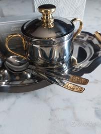 Vendo set vintage Inoxriv/Gemma Oro realizzato in Italia, in acciaio inox 18/10, placcato oro 24k composto da piccolo vassoio con lattiera e piccola zuccheriera con coperchio con Certificato Garanzia.