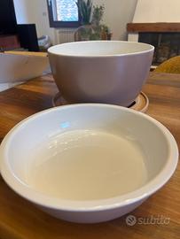 Set di 3 pezzi insalatiera , una bassa da 25 cm e una alta da 25 cm color lilla e interno bianco una dentro all’altra , coperchio in legno che funge da coperchio o vassoio ! Nuovo e di qualità, in confezione originale .