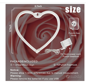 Vendo Insegna al neon a forma di cuore colore rosa luce a led uniforme alimentata a batteria o usb. Nuovo con scatola misura circa 22 cm . Si può alimentare tramite usb , anche con un power bank o con 3 batterie AA non incluse . Ottimo effetto rosa tenue romantico e fiabesco . Per ambienti o feste .