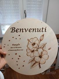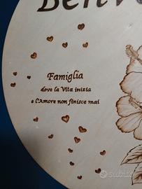 Insegna di legno compensato con la scritta BENVENUTI e la frase sulla FAMIGLIA. L'ho fatta a mano con la tecnica di pirografia. ร appendibile ed anche attaccabile alla porta o al muro essendo sottile e leggero.