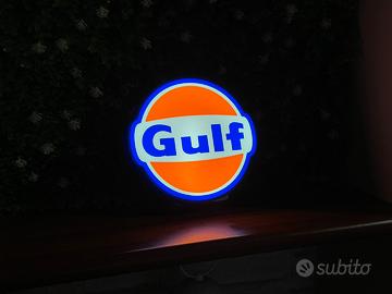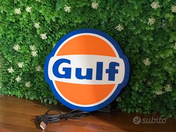 Splendida insegna luminosa con l'iconico logo Gulf Oil, uno dei marchi più leggendari nella storia del motorsport.