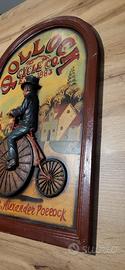 Insegna cartello pubblicità Pollock Cycle in rilievo raffigurante un ciclista su una bicicletta d'epoca, in legno vintage