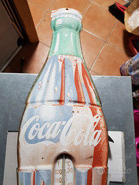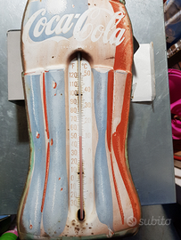 Vendo vecchia insegna pubblicitaria della coca cola, in lamiera con termometro ancora perfettamente funzionante. Altezza 74 centimetri e larghezza 21,8 centimetri .Penso risalga agli anni 50 o 60, completamente originale, mai stato ritoccato. In discrete condizioni, con gli inevitabili segni del tempo. Oggetto molto bello, difficile da trovare completamente originale, soprattutto non pasticciato. Perfetto per arredamento in locali o in qualche salotto stile vintage. Trattabile
