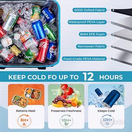 Raffreddamento da campeggio con alte prestazioni isolanti: design a 5 strati di isolamento premuroso. Il morbido strato esterno della borsa termica è realizzato in tessuto Oxford 600D con uno strato aggiuntivo di PVC impermeabile. Borsa termica isolata con schiuma EPE da 5 mm e materiale isolante in tessuto PEVA può mantenere il cibo caldo o fresco per lunghe ore. Può congelare fino a 12 ore per soddisfare le vostre esigenze di bevande fredde.