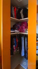 completa di 2 letti (a castello con scaletta e spondina), una scrivania retraibile, 1 armadio angolare, altri 2 armadi, 3 cassettoni (di cui uno doppio), mensole e cassetti; colori giallo, arancione e rosso (NO Ikea o Mondo