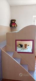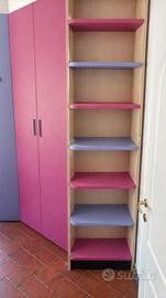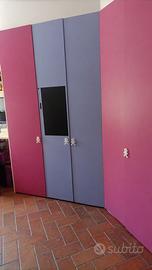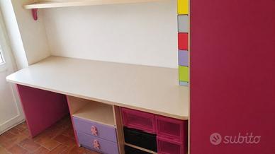 Camera da letto in ottime condizioni lilla e rosa, letto a castello com tre letti di cui uno estraibbile. Comodissimo non solo per la quantità di persone che ospita, ma anche per i contenitori che sono all’interno sia delle scale che del corridoio del letto sopra. L’armadio è composto da 3 armadi uno da 1 anta e 2 da due ante, un armadio è cabina armadio quindi doppia comodita data anche dalla luce interna nella cabina. La scrivania é abbinata sia agli armadi che ai letti, la scrivania e dotata anche da cassetti comodi per poter contenere ció che può servire in quell’ambiente. Ritiro a domicilio, a carico dell’aquirente