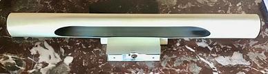 Originale lampada ‘space age’ da parete / applique (anni ’70) di forma tubolare, di colore bianco (con due tappi neri alle estremità) di lunghezza cm 60 ca., fornita di una grande finestra centrale ellittica dotata al suo interno di due attacchi - uno per lato - per lampadine con tipo E14. Il tubo cilindrico viene posizionato orizzontalmente e può essere inclinato, grazie ad una base di supporto snodabile, da fissare a parete. Impianto elettrico da revisionare. Modelli simili in ottone (Egoluce 4040) sono presentati sul web. Perfetta per collocare una fonte di illuminazione di design per quadri, specchi, bagno...