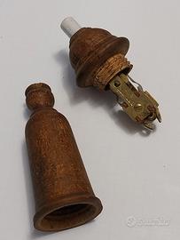 Interruttore vintage in legno con un piccolo inserto in ceramica bianca. Non so se funziona. - Materiale: legno. - Dettaglio: inserto in ceramica.