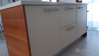 Vendo bellissima isola da cucina utilizzabile anche come bancone/credenza. Colore ripiano avorio, con fianchi struttura in noce nazionale dogato. Il piano e' in laminato. Misure: ripiano 190 cm lunghezza, 80 cm larghezza ( base 184 cm x 74 cm). E' composta da 2 cestelli centrali da 60 cm e 2 pensili da 60 cm laterali con ripiano interno. Condizioni piu' che buone, sia interne che esterne (piccola crepa sul bordo sx del piano, vedi foto). Marchio Ernestomeda Cucine. Foto con dettaglio isola e interni.
