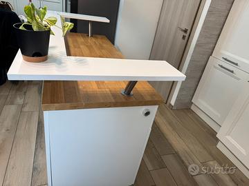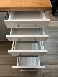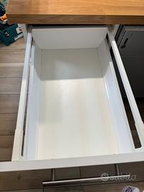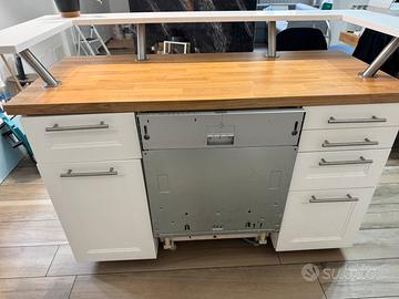 Isola per cucina con due mobili con cassetti e uno sportello, pensata per ospitare una lavastoviglie centrale da 60 cm, ma ci si può aggiungere anche un altro mobile ikea da cucina della stessa linea. Le misure dei mobili sono: larghezza 40, profondità 60, altezza 80. Tutta l’isola in totale è 140 cm per 60 cm (misure della base). Il mobile è smontato (non completamente) é trasportabile in auto, ho anche un pannello posteriore grande (quello centrale) in più nuovo e impellicolato. Solo ritiro a casa in zona Prato Fiorito.
