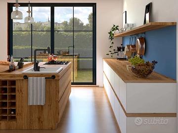 parete cucina in stile moderno, un abbinamento che unisce innovazione e luminosità di un arredamento contemporaneo alla solidità e al richiamo di un calore di altri tempi dell’isola cucina, realizzata tutta in legno massello.