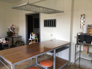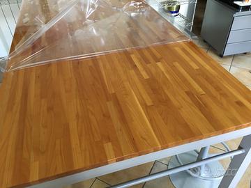 Isola tavolo da lavoro con piano in ciliegio come nuovo , due sgabelli e griglia appendi oggetti, il piano è sempre stato coperto da cerata trasparente.