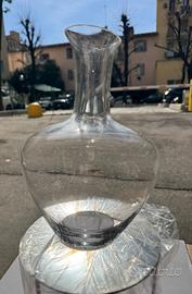 Decanter di design per vino in vetro soffiato a bocca. Capienza 0,75 lt. Supporto in metallo, progettato per consentire il posizionamento in 3 modalità: verticale, inclinato e capovolto.
