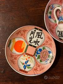 Set 5 tazzine e 5 piattini in pregiata porcellana giapponese "guscio d'uovo" anni '50, decorati a mano con motivi di lanterne e natura. La particolarità unica è la "litofania": guardando il fondo delle tazzine controluce appare il volto di una Geisha in trasparenza. Oggetti vintage da collezione in ottime condizioni, estremamente sottili e raffinati.