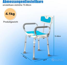 Per acquisto errato, vendo sedia doccia di marca Jopassy costituito da sgabello da doccia regolabile in altezza, con piedini in gomma antiscivolo,carico massimo 136 kg. Realizzato in plastica di alta qualità e lega di alluminio, la sedia è leggera, impermeabile, durevole e sicura. Le pareti del tubo più spesse e l'imbottitura antiscivolo garantiscono una forte capacità di carico e un uso affidabile. Utile per persone con difficoltà di movimento, adatto per bagno per evitare incidenti. La sedia da bagno in lega di alluminio con sedile in PE e tappetino in gomma regolabile a 6 livelli è un'ottima scelta. Sedile a forma di U per una facile pulizia. S Sedile con foro di scarico per evitare l'accumulo di acqua Lo sgabello da doccia è regolabile in altezza su 6 livelli per raggiungere l'altezza perfetta di seduta da 37,5 a 50,5 cm con incrementi di 2,54 cm. La sedia da doccia ha uno schienale rimovibile e braccioli reversibili per una migliore facilità d'uso. Dimensioni del prodotto: 44,5 x 40 x (73 – 86). Larghezza bracciolo: 44 cm. Altezza della seduta: 37,5-50,5 cm. Altezza bracciolo: 56-69 cm. Portata massima: 136 kg, regolazione in 6 livelli, ogni livello 2,54 cm Materiale: Seduta e schienale: Imbottitura in HDPE e schienale: Braccioli in EVA: Imbottitura in schiuma: TPR. Telaio: lega di alluminio Dimensioni del collo:55x35x16cm; 4,1 Kg Tipo di tessuto:Lega Peso massimo raccomandato:136 Chilogrammi