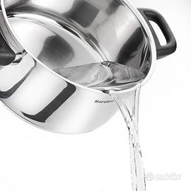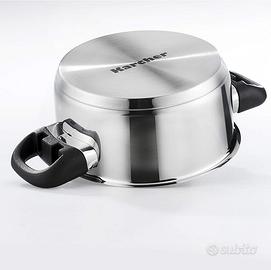 Materiale: in pregiato acciaio inox (non si deforma, non altera i sapori, è semplice da pulire) con manici in plastica che non si surriscaldano durante la cottura
